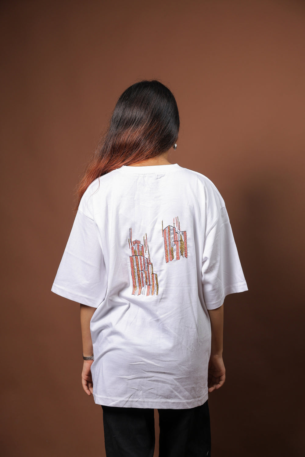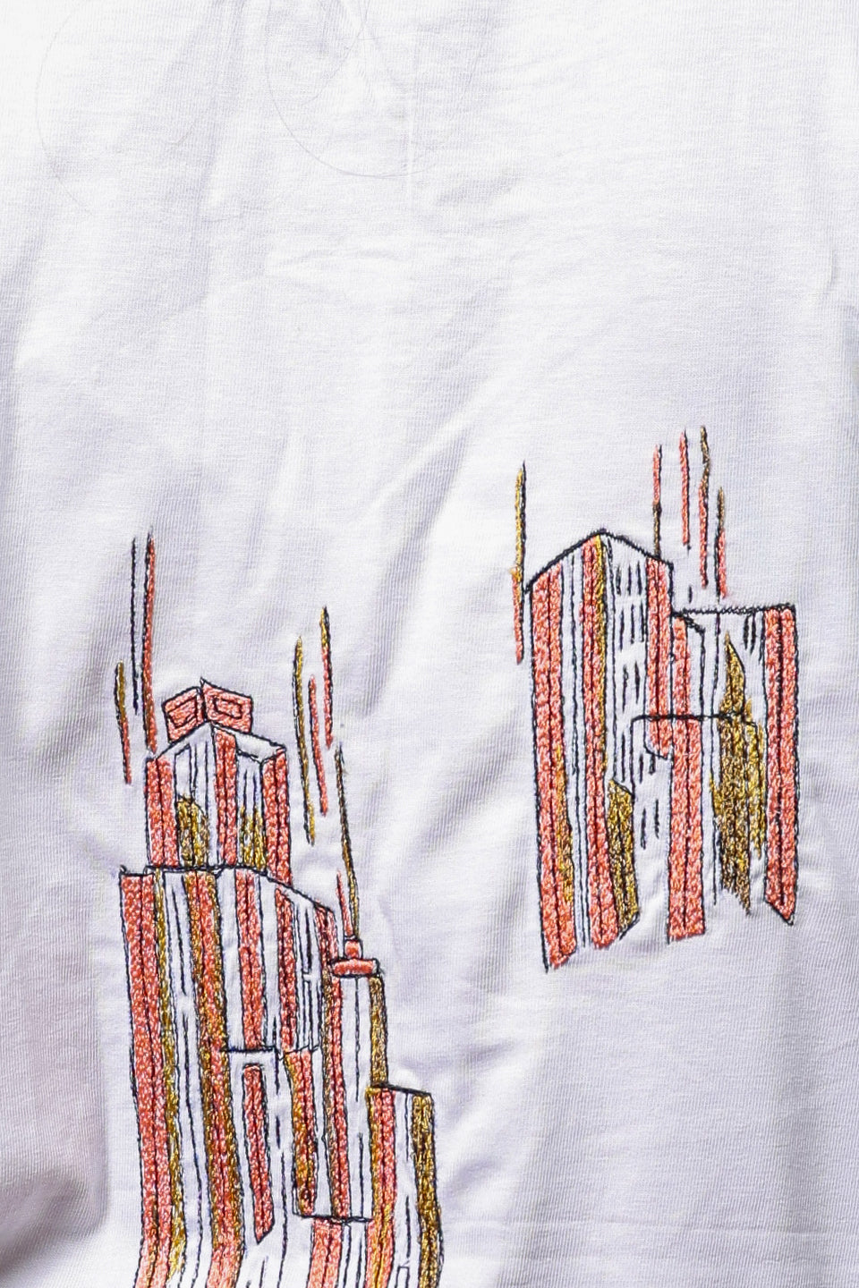 Introducing our exclusive White Cotton T-Shirt featuring abstract cityscape embroidery – where fashion meets modern art.
