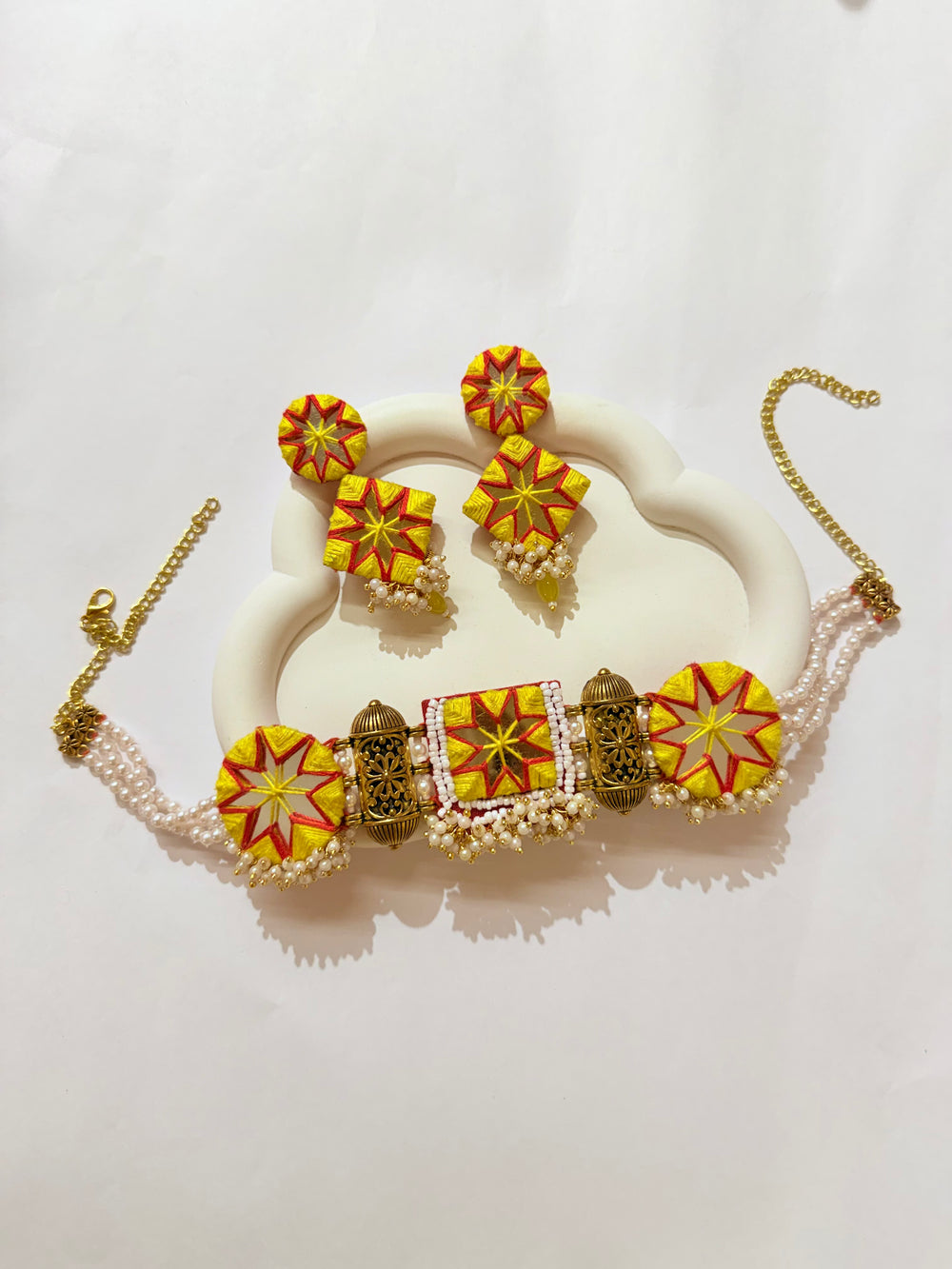 A radiant fusion of tradition and modern charm — this jewellery features intricate mirror work, vibrant thread detailing, and the timeless elegance of pearls. Each piece is handcrafted with patience and precision, reflecting the soul of Indian artistry.