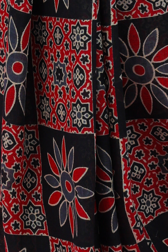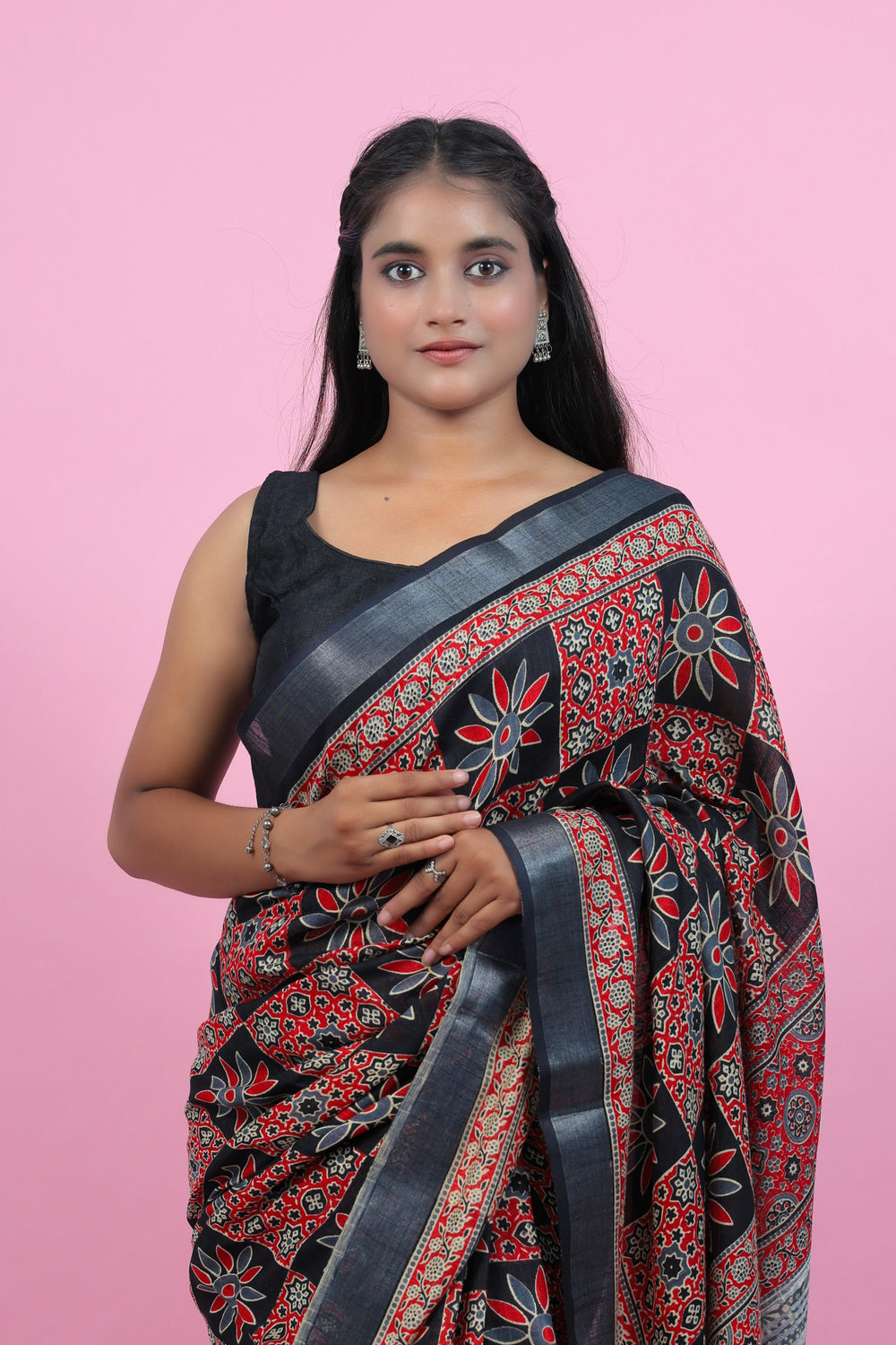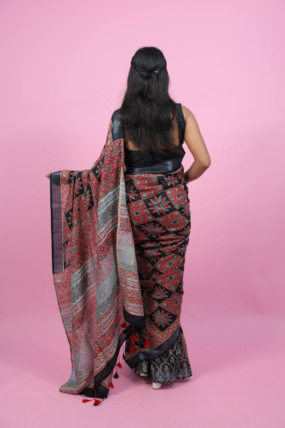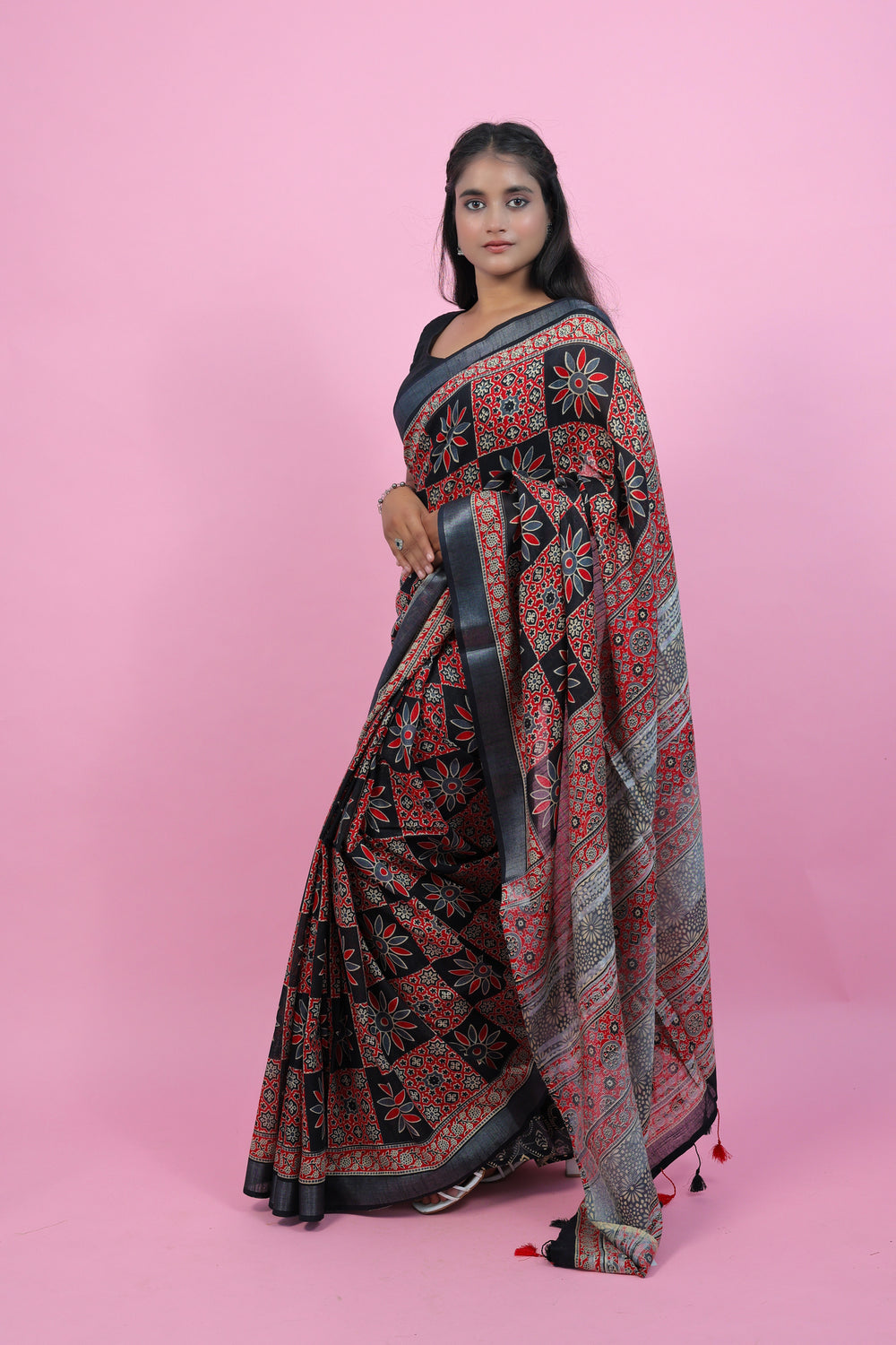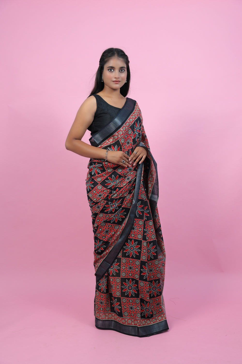 Experience class and culture with our Gajgamini saree, featuring a traditional ajrakha print. Made with intricate details and vibrant colors, this saree offers a timeless and elegant look for any occasion. Elevate your wardrobe with this statement piece.