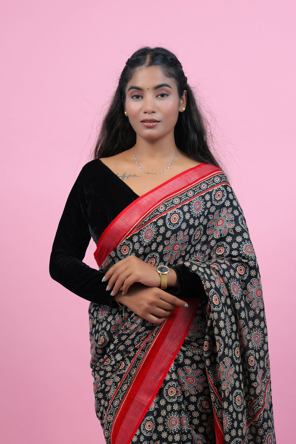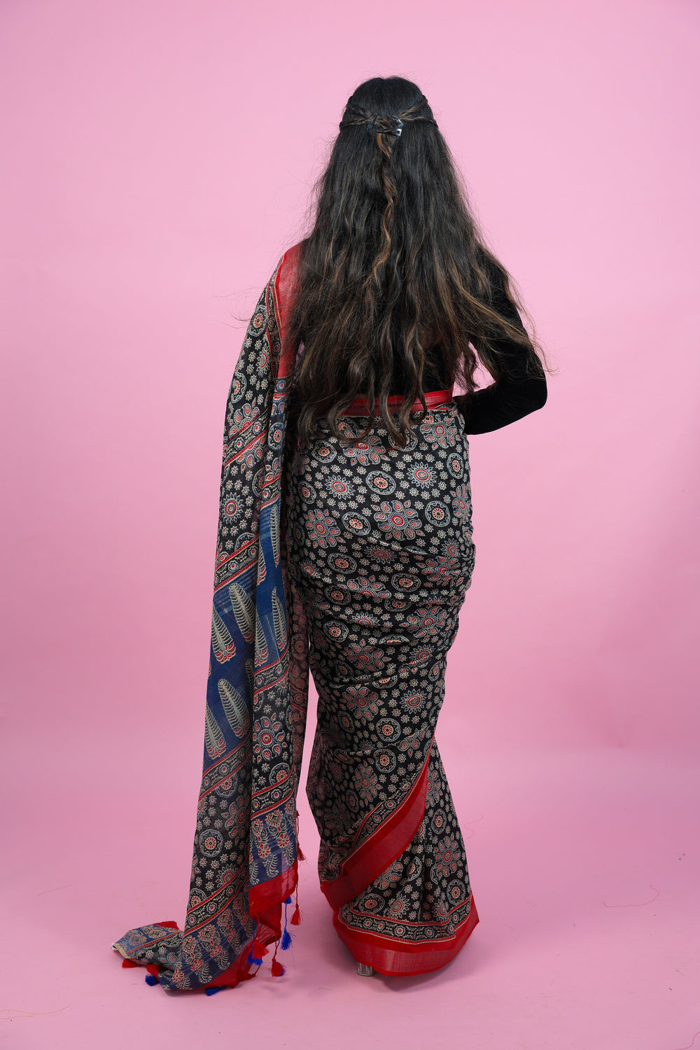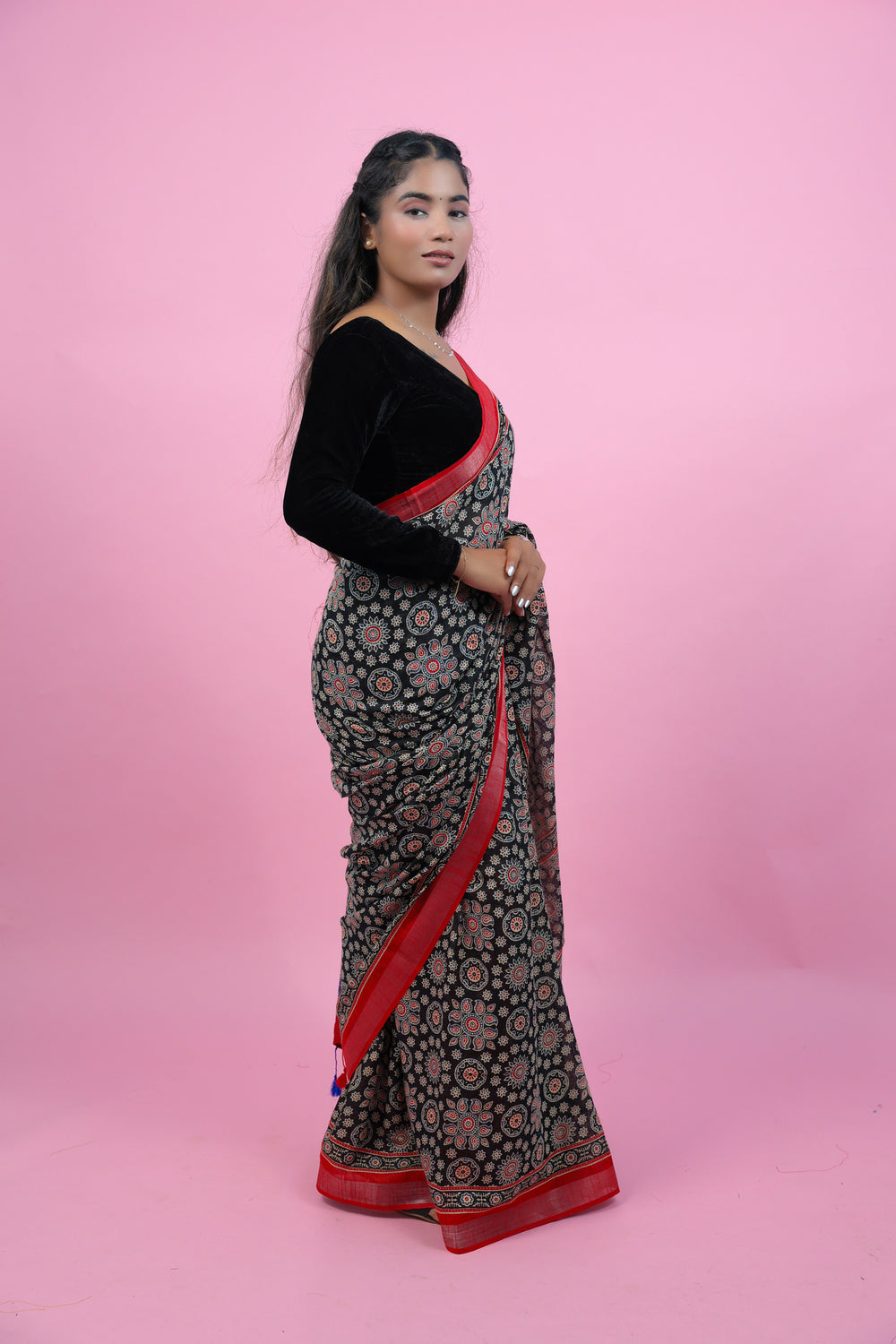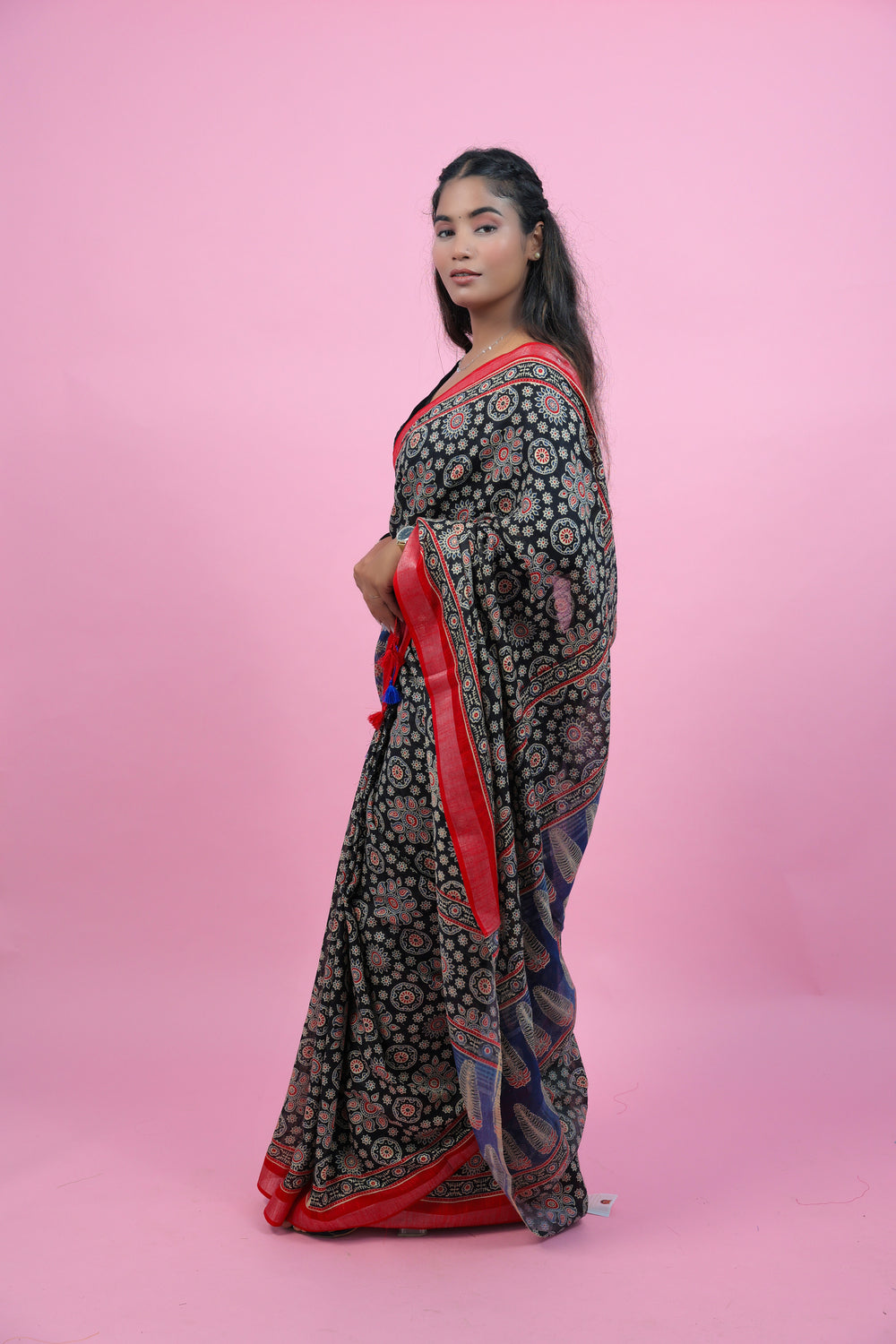 Crafted with expert precision, Gajgamini showcases a beautiful ajrakha print on high-quality linen saree. With its intricate design and lightweight fabric, this saree is perfect for any occasion, offering both style and comfort. Elevate your traditional wardrobe with this must-have piece.
