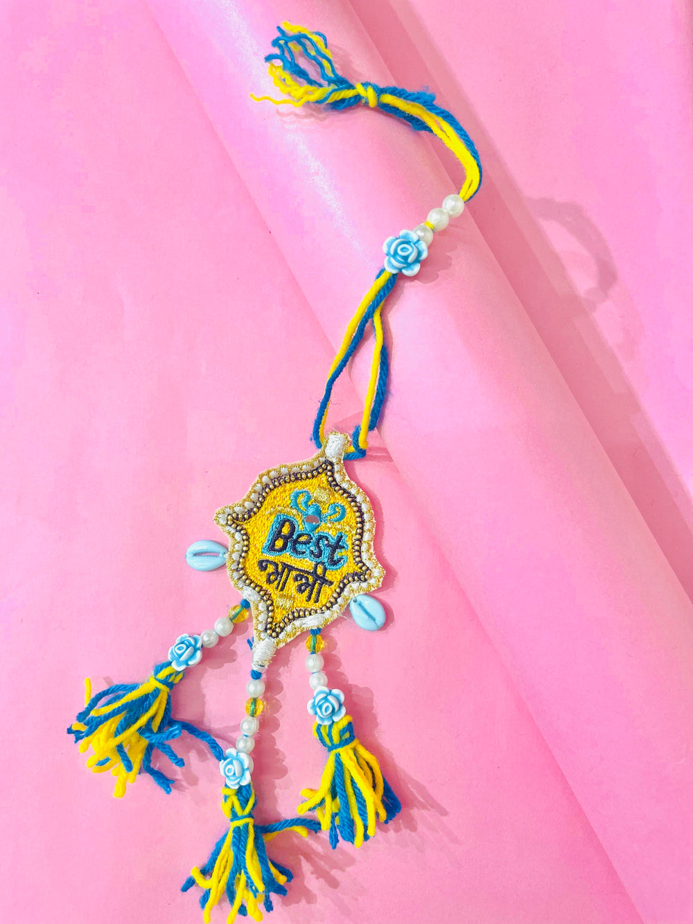 Celebrate the special bond with your Bhabhi this Raksha Bandhan with our beautifully handcrafted Rakhi. Designed with delicate resham threads, moti work, and gotta patti detailing, this Rakhi adds an elegant touch to your festive celebrations. Perfectly made with love and care, it’s a thoughtful token of affection for your dear sister-in-law. Eco-friendly, lightweight, and skin-friendly design ensures comfort and style. Order now for fast delivery and make this Rakhi truly memorable."