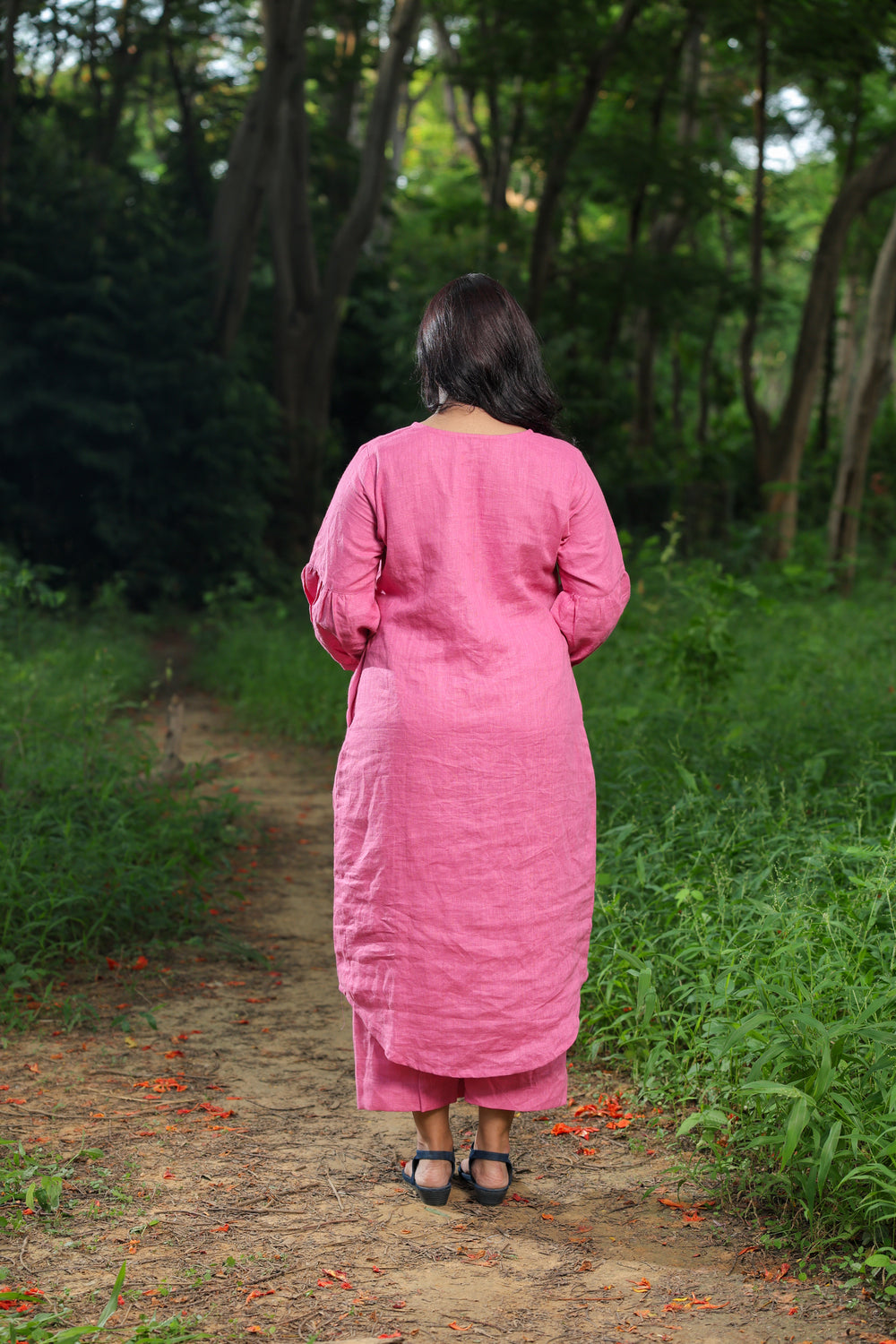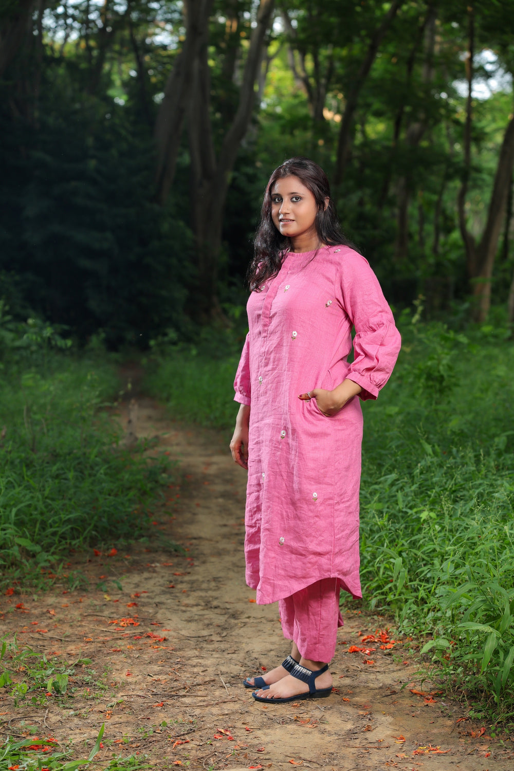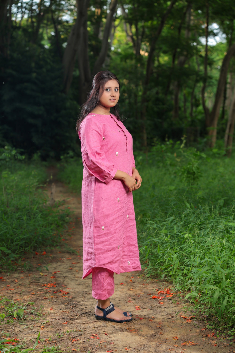 Constructed from high-quality linen, this Khadi kurti features elegant embroidery for a touch of artisanal charm. Experience the comfort and versatility of linen while showcasing your unique sense of style with this beautifully crafted piece.