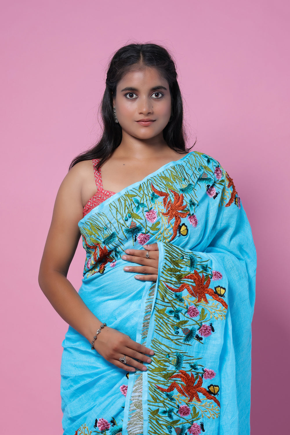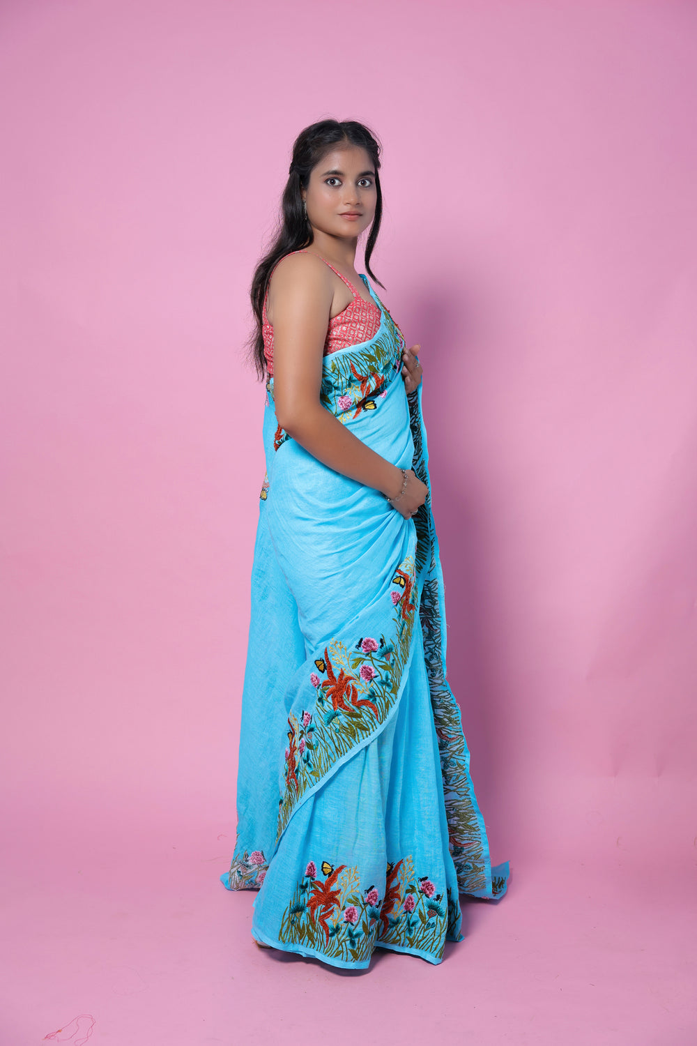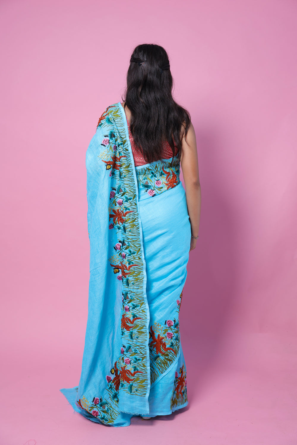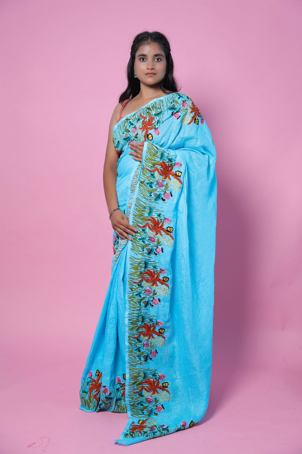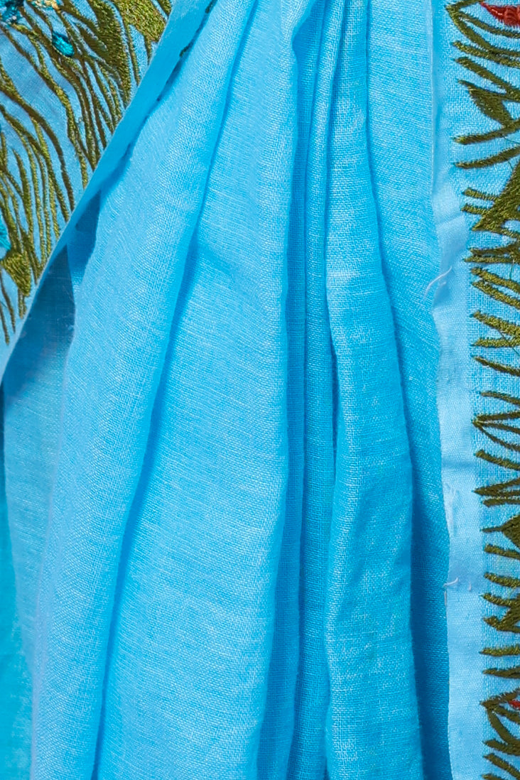 This Nila Jahan blend of machine embroidery and linen creates a stunning saree with a vibrant greenery theme. Experience a seamless blend of traditional and modern design with this unique piece. The intricate embroidery adds a touch of elegance, making this saree a must-have for any occasion.