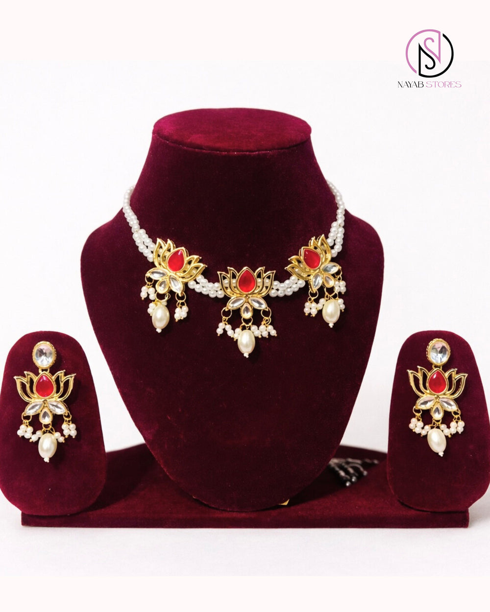 Embrace timeless elegance with this Red Lotus Pearl Necklace Set, inspired by traditional temple motifs and handcrafted detailing. The necklace features graceful lotus-shaped elements highlighted with rich red stone accents, clear kundan-style stones, and delicate pearl drops, creating a regal yet balanced look.