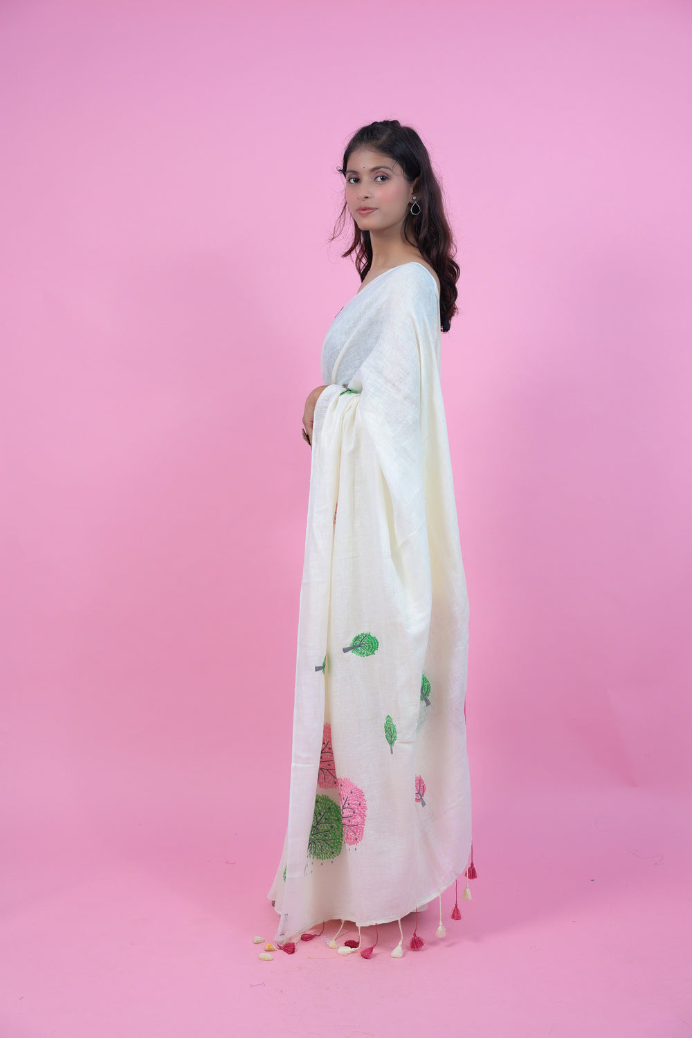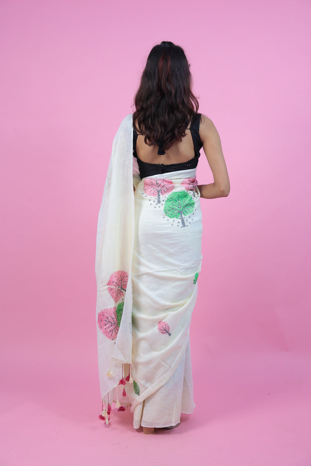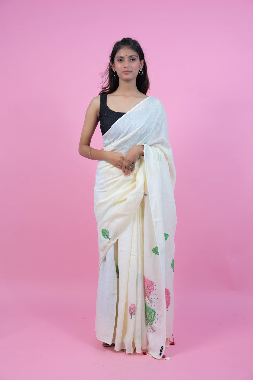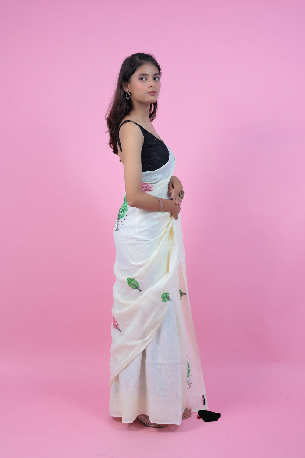 Safed Gulaab offers a hand-embroidered linen saree that exudes elegance and sophistication. Each piece is crafted with precision, showcasing the intricate artistry of skilled artisans. Immerse yourself in the luxurious feel and timeless beauty of our Safed Gulaab saree.