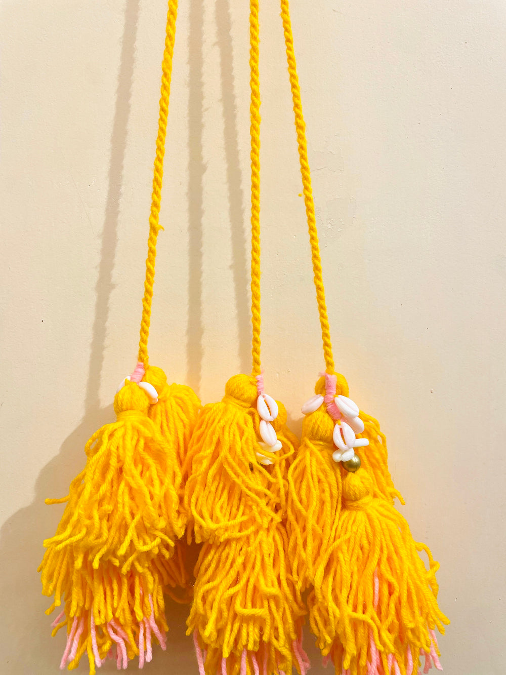 Add a burst of tradition and brightness to your hairstyle with our Sunshine Bloom Handcrafted Paranda. Made with premium-quality yellow and soft pink threads, this paranda is beautifully finished with authentic cowrie shells for a touch of ethnic charm.